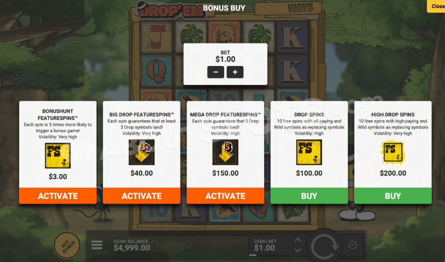 ハイ ドロップスピンボーナスを有効にし、選択プールの中で最高額のシンボルとワイルドから開始します。