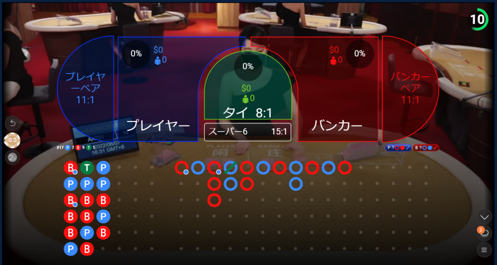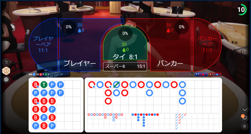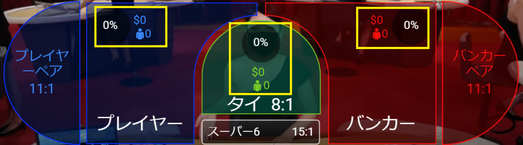プレイヤー、バンカー、タイのそれぞれのベッティングテーブルにベットされた人数や金額をリアルタイムで確認することができます。