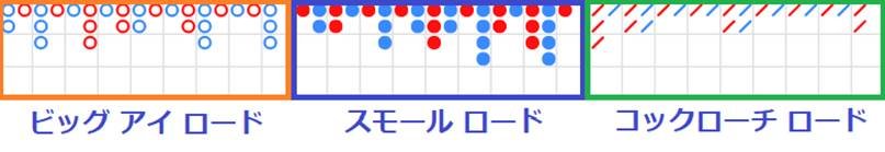 ビッグ アイ ロード、スモール ロード、コックローチ ロードの3種類から構成され、過去の結果から取ったパターンを表示していきます。