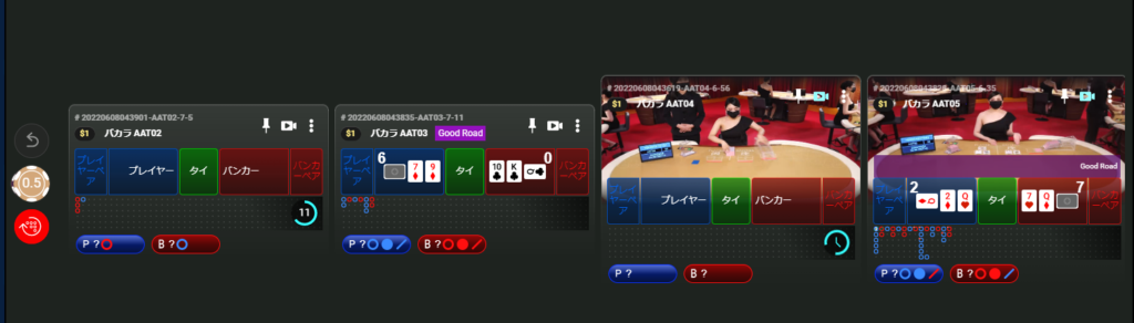 終了したラウンド数、プレイヤーの勝利数、バンカーの勝利数、タイのラウンド数、プレイヤーペア数、バンカーペア数を確認することができます。