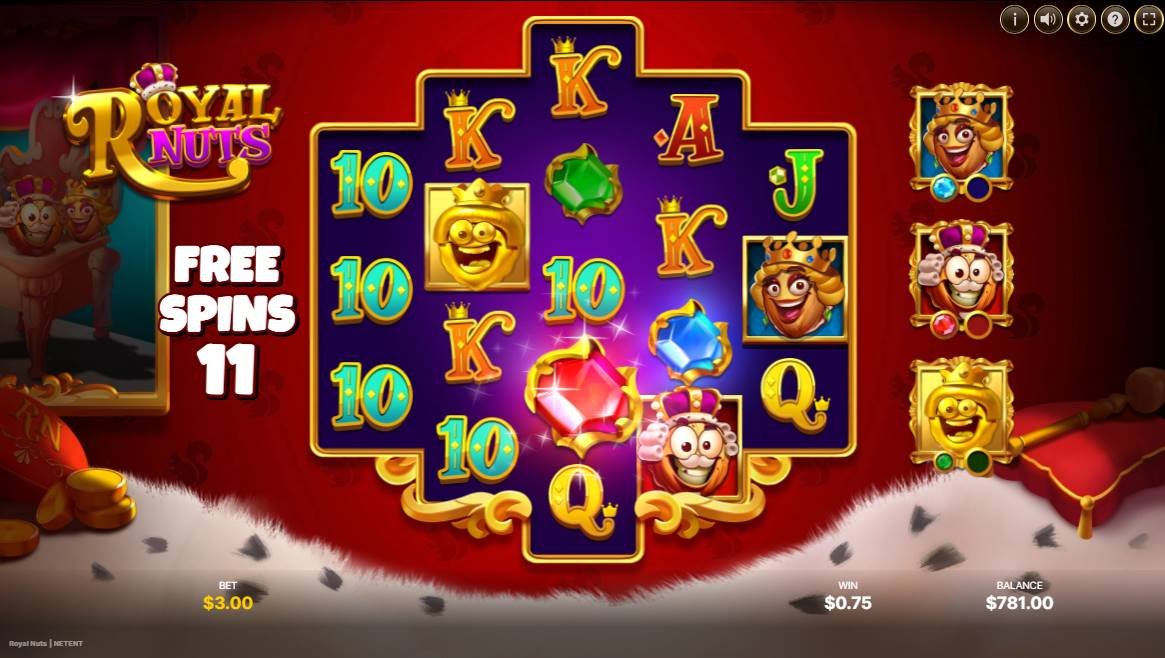 リールの横にあるロイヤルナッツは、各ロイヤルナッツシンボルの色に対応する青、赤、または緑の宝石を集めます。