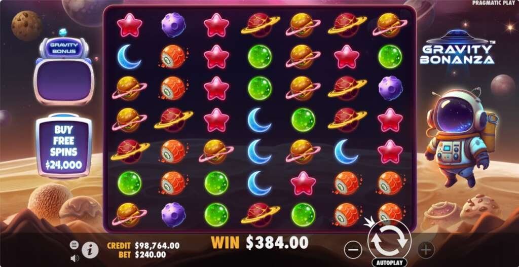 『Gravity Bonanza』は、7×7のスロットで、各スピンで5個以上の同一シンボルが隣接して着地すると配当成立が成立します。