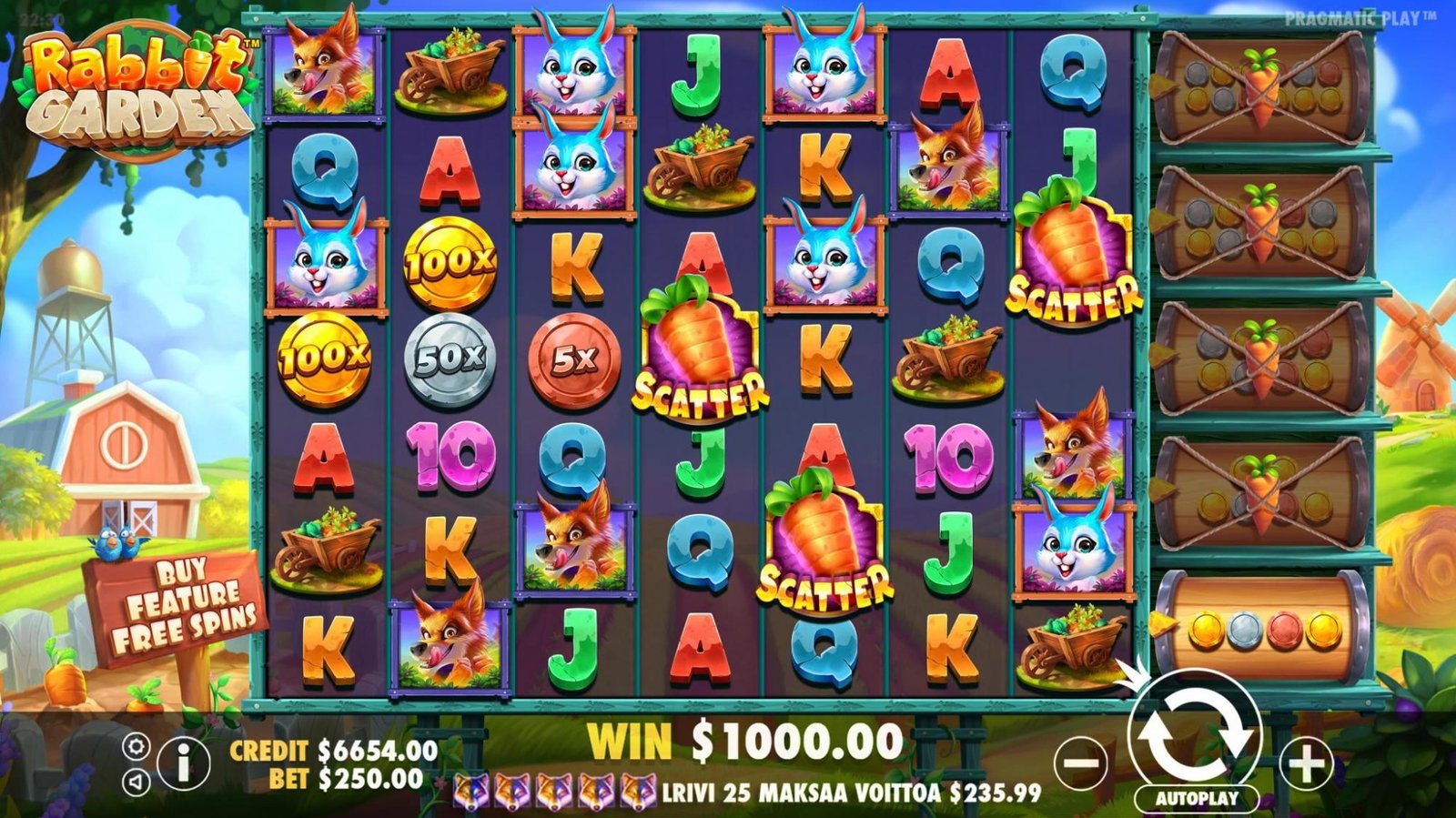 にんじんスキャッターシンボルが 4つ以上着地すると、5回のフリースピンと、獲得した時のにんじんスキャターシンボルの数に応じてそれぞれ2倍、5倍、20倍、100倍のマルチプライヤーを獲得します。