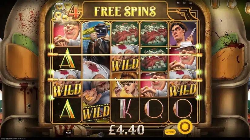 フリースピンが始まる前に、バグジースペシャルで3つのショット グラスのミニグリッドをスピンし、フリースピンに対して追加の特典を獲得します。