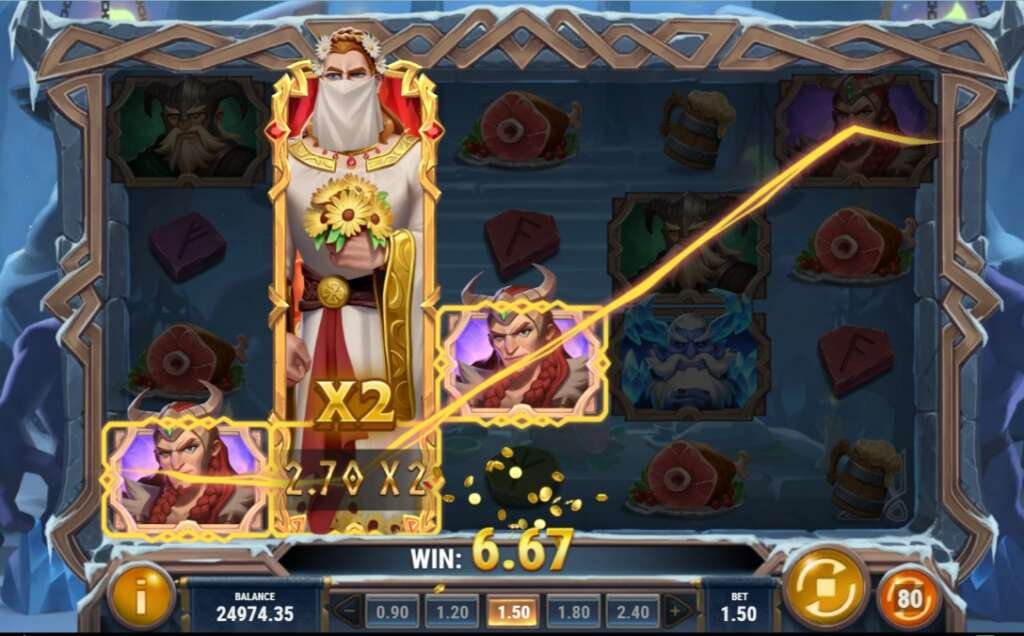フリースピンに入ると、1ラウンド目から右端にトールが現れ、拡張ワイルドシンボルとなり、スピンするたびに左に1マス移動し、フリースピン終了まで勝利倍率が増加していきます。