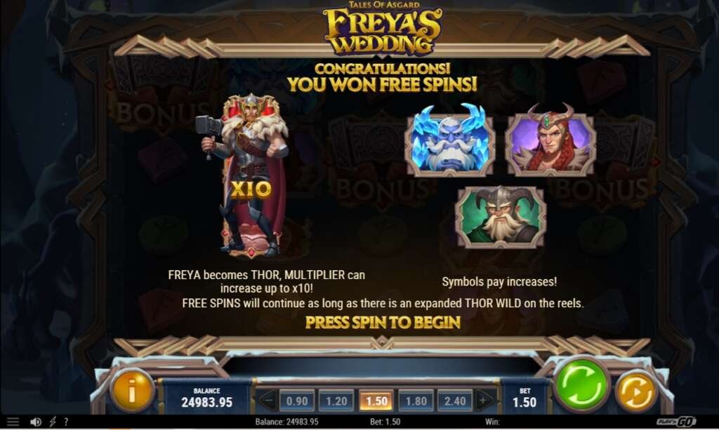 花嫁のフレイヤがランダムに登場し、ランダムに1リールをワイルドシンボルに変え、うまくつながると2倍の配当となります。