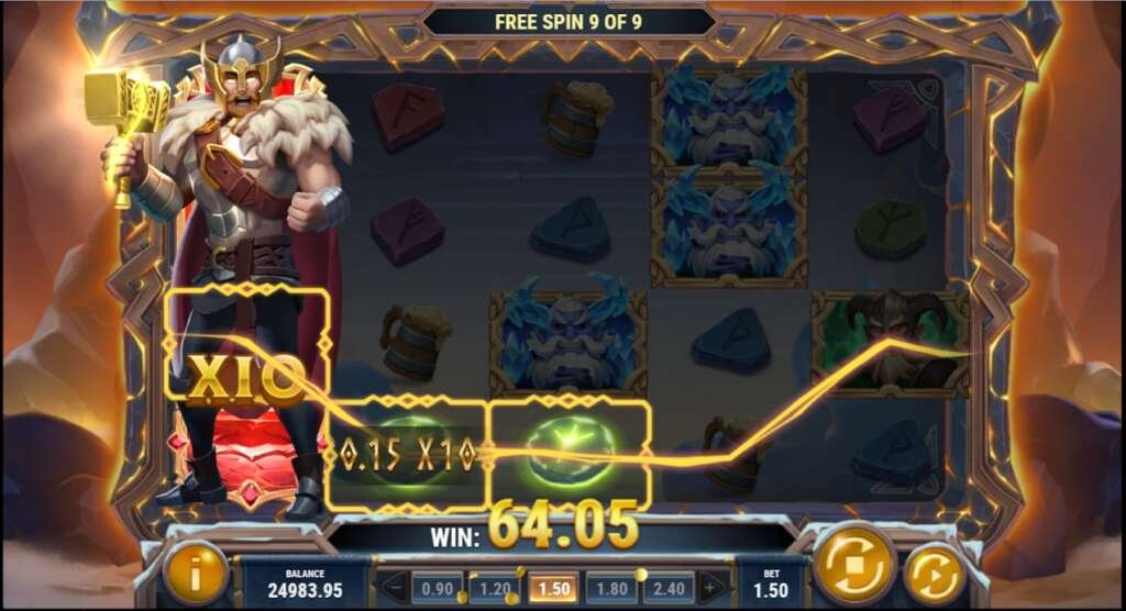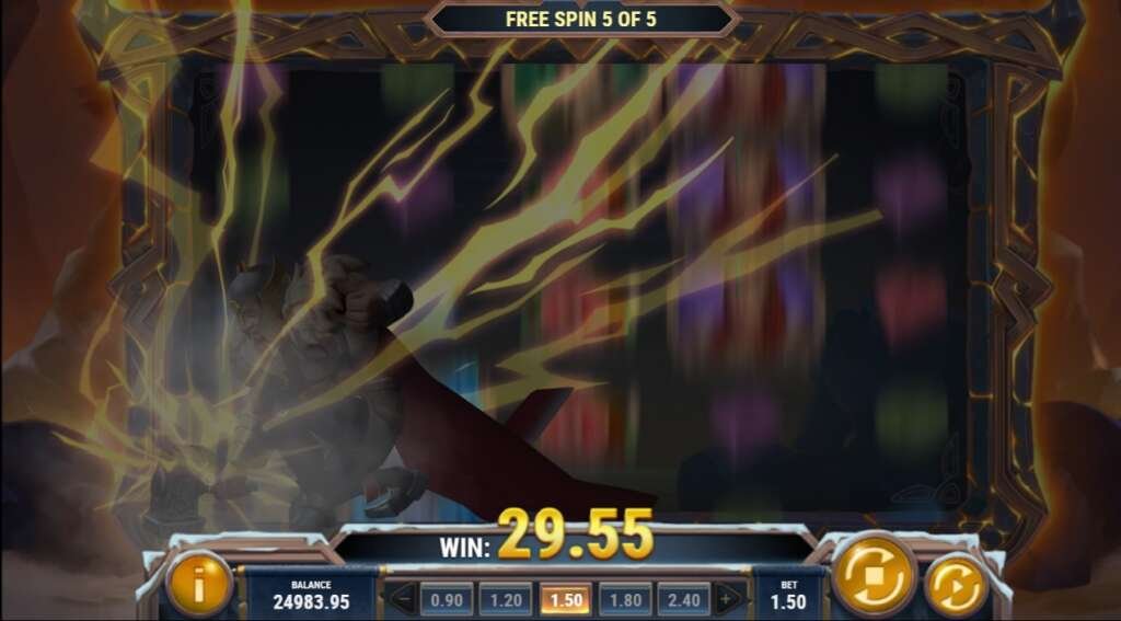 *フリースピンでは、トールとスリュムのバトル演出が毎回あり、トールのミョルニルの轟音とともに、プレイヤーのボーナスも増加します!